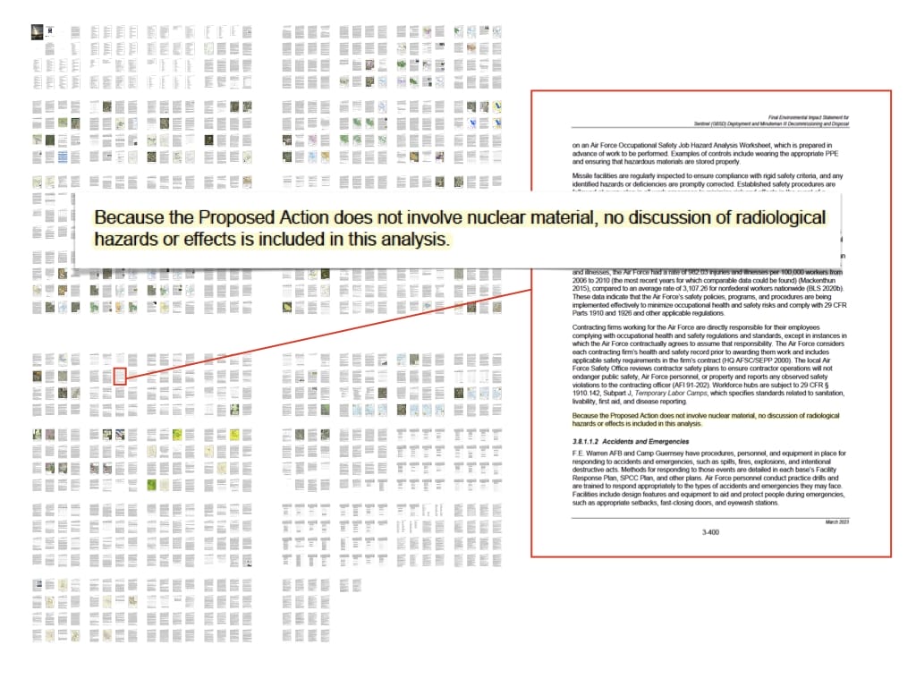 As a result, no discussion of radiological hazards or effects was included in the environmental impact analysis, which the Air Force said was likely the largest-scoped environmental impact analysis ever conducted under NEPA.