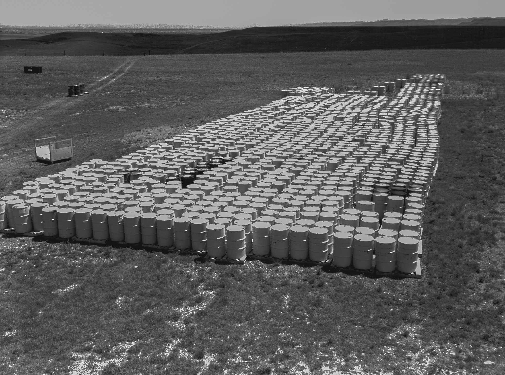 Waste drums stored outside between 1958 - 1967 leaked 5,000 gallons of cutting oils contaminated with plutonium, americium and uranium at the Rocky Flats plant, Arvada, CO (Photo: Office of Legacy Management, Department of Energy, 1962).