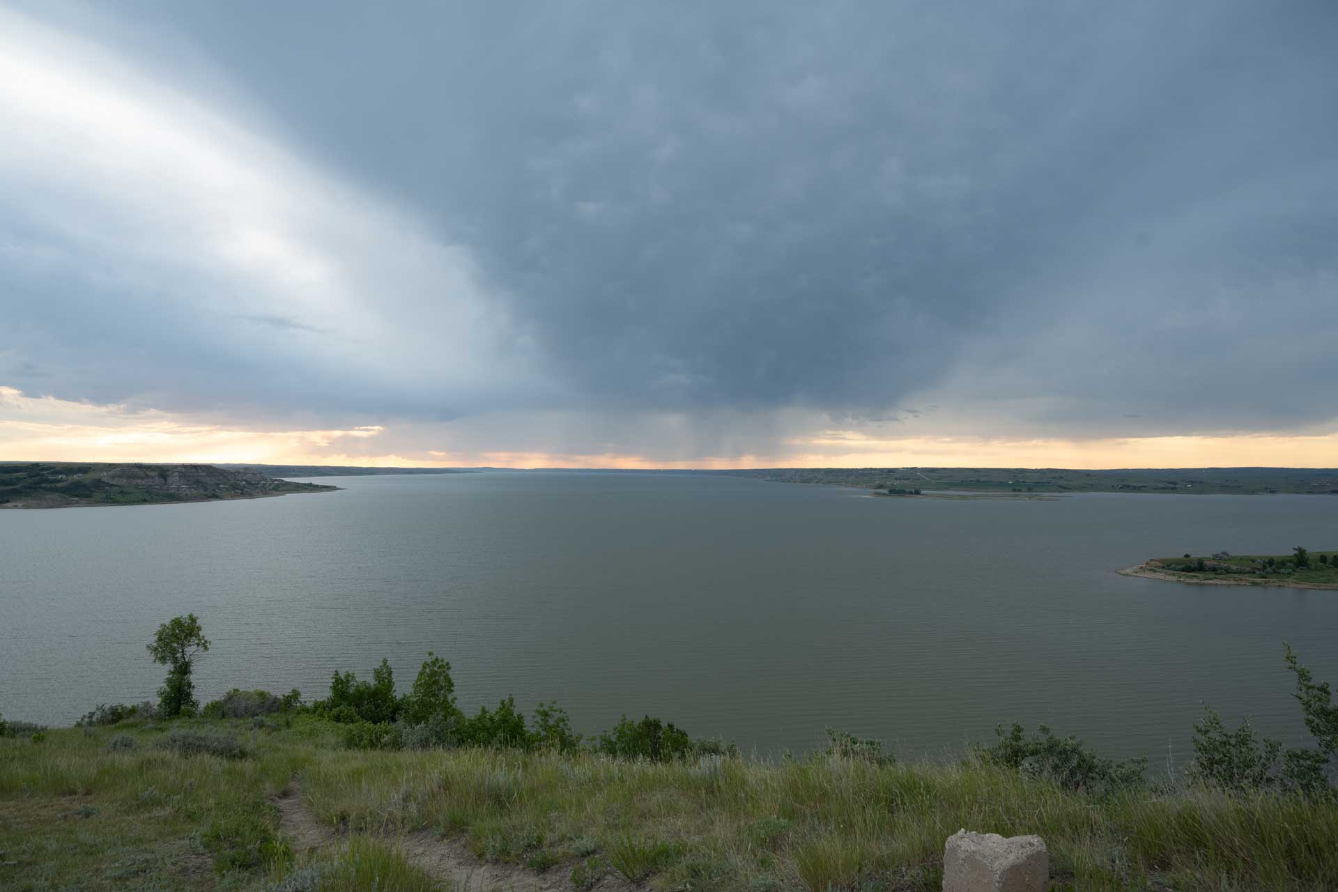 The creation of the Garrison Dam in 1953, by the U.S. Army Corps of Engineers, flooded most villages on the Fort Berthold Reservation and forced the relocation of 325 families.The dam also created Lake Sakakawea which divides the reservation in half. New Town, ND (Photo by Nina Berman).