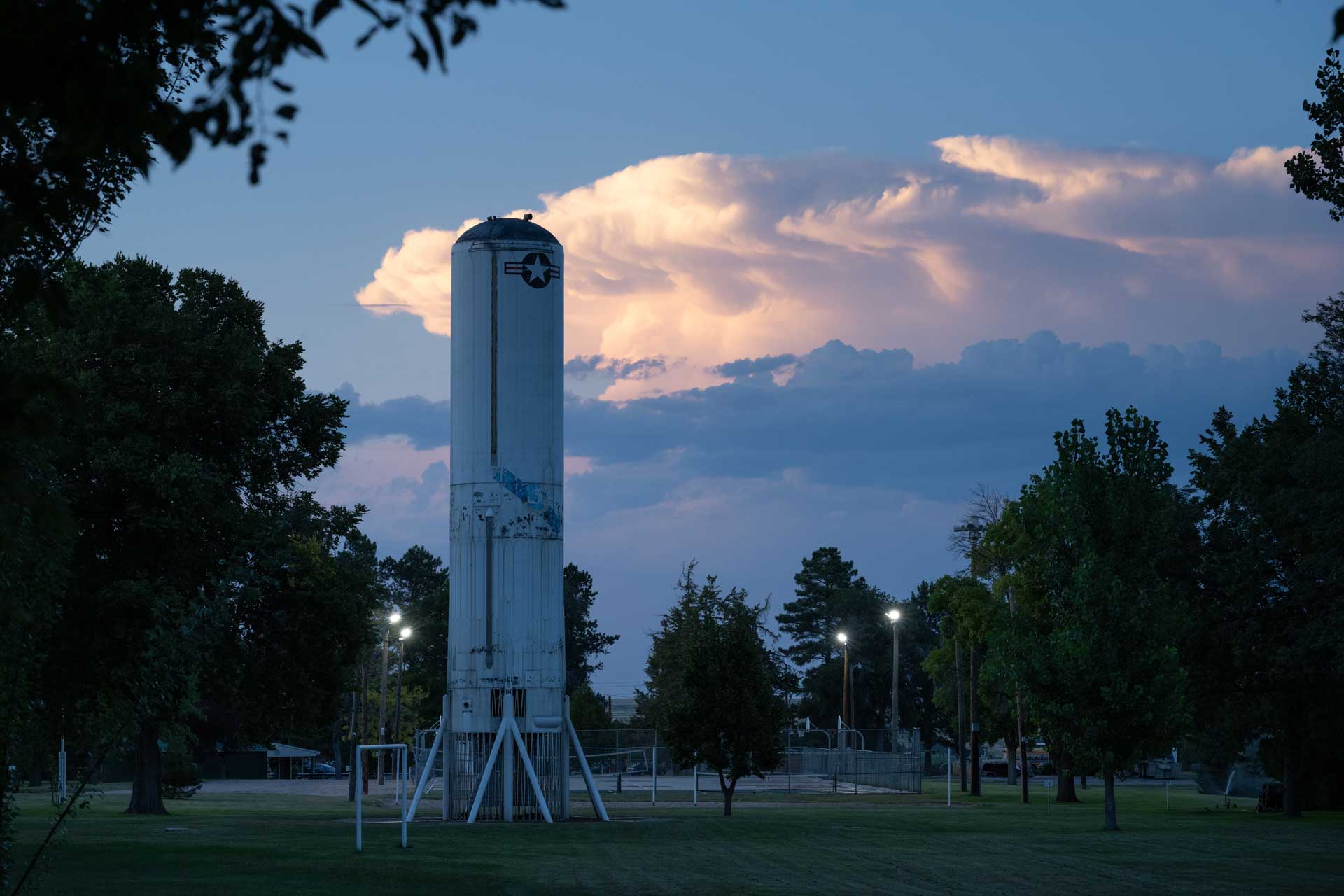 A decommissioned Titan I land-based nuclear missile stands in a park in Kimball, NE. The city is known as “Missile Center USA.” Erected in 1968, the deteriorating missile was removed in September 2023 because it had become a public hazard. (Photo by Nina Berman).