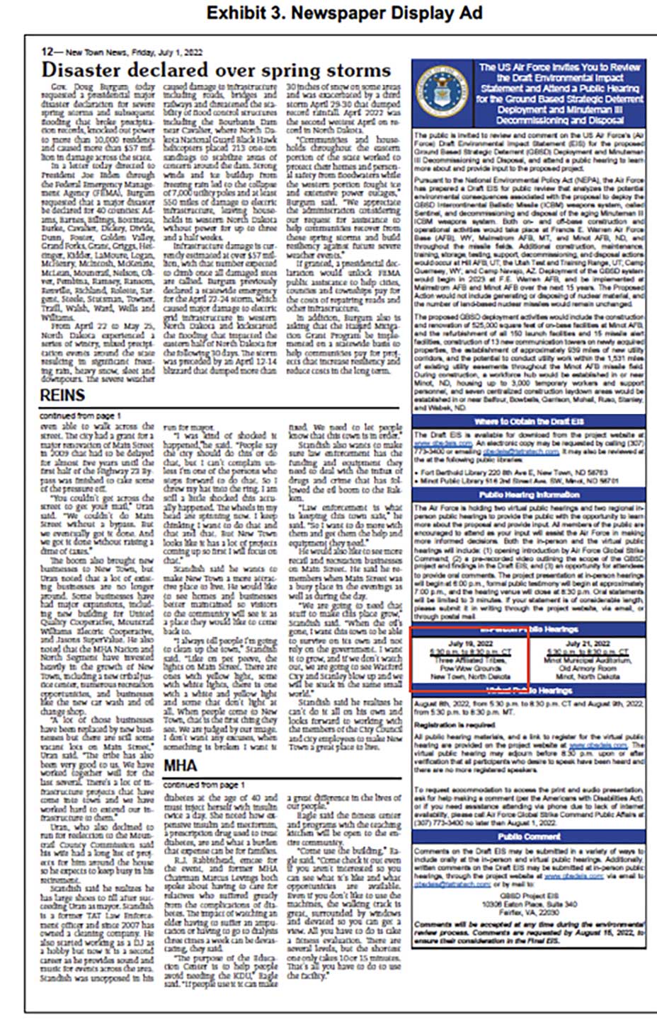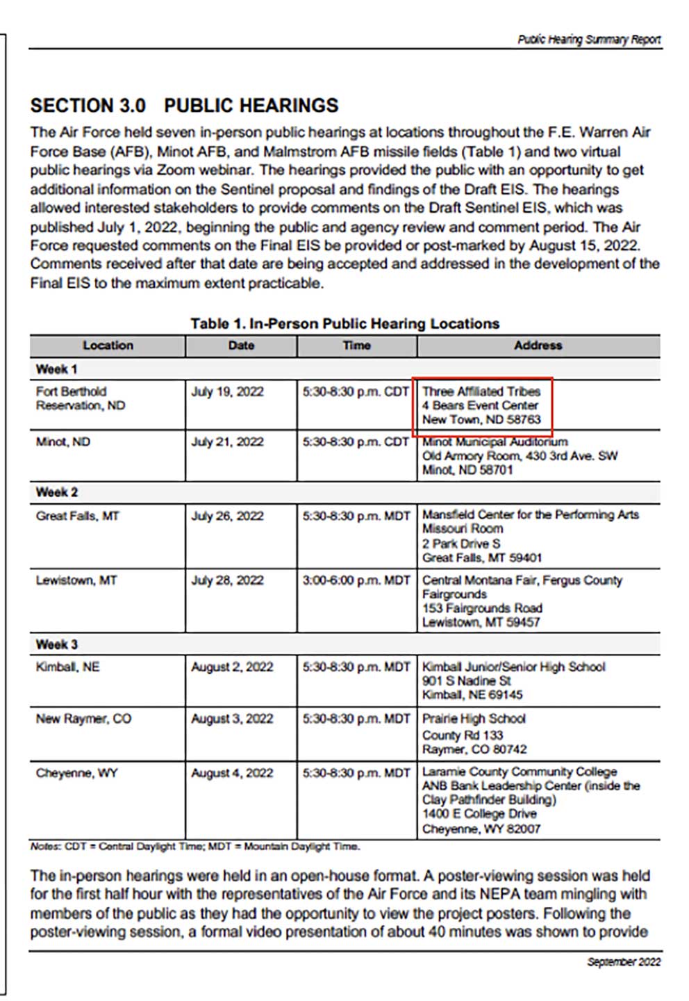 The 1st Environmental Impact Statement hearing took place at another location than advertised in local newspapers and on the radio. (Source: PUBLIC HEARING SUMMARY REPORT FOR THE ENVIRONMENTAL IMPACT STATEMENT FOR THE SENTINEL DEPLOYMENT AND MINUTEMAN III DECOMMISSIONING AND DISPOSAL, AIR FORCE, September 2022).
